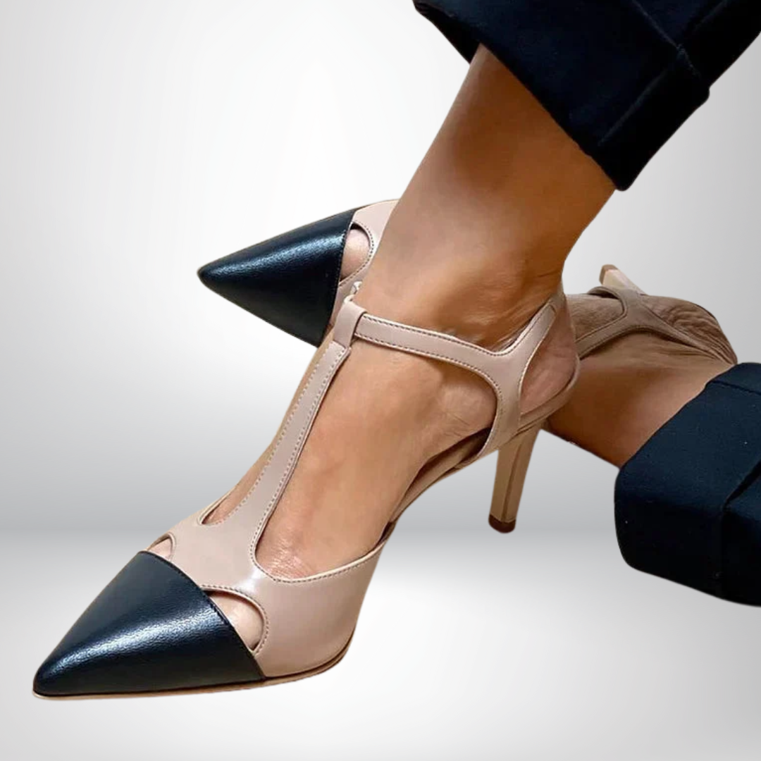 Mirella is the shoe that fuses class and character. The T-bar line combines with a sharp pointed toe in contrasting black for a refined and modern effect. Perfect for the office, the evening, or whenever you want to feel at your best.